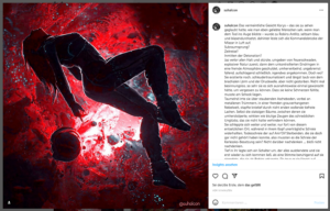 Basis des Textes ist der Prolog zu SPACE to SPACE Band 4, den ich aber gehörig umschreiben und anpassen musste, damit er die erlaubte Zeichenanzahl nicht überschreitet, was recht knapp wurde. Zeigte mein Word noch 1.992 an, so schnitt das Fenster im Teilnahmeformular ein Stück des letzten Wortes ab. Die beiden hatten irgendwie unterschiedliche Auffassungen von 2.000 Zeichen inkl. Leerzeichen … o.O Also musste ich noch etwas kürzen. Auf Instagram wurde es dann auch eng, hatte kaum noch Platz für ein paar erklärende Worte^^ Als Foto habe ich mein Coverbild benutzt und in blutrot eingefärbt, was sehr gut passt, da sich Jaz im Sturz befindet und dort wo sie landet, vieles wie Blut aussieht.